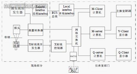 探头感应X 射线强度并转化为电流信号(10-12~10-7A),经测量转换器放大并转变为数字信号后经由工业以太网,利用光纤介质快速、稳定地传输到仪表控制室,光纤传输介质转换为5 类双绞线后,连接到系统内部网络交换机,数据最终被M—Client 计算机获得。M—Client 获得数字化的厚度测量值,进行一系列计算处理,处理后的数字量一路用于M—Server 计算机内的软件显示、控制,通过V—Client 显示器观察;另一路转换为模拟量,输出到现场总线Interbus 模拟量模块,并最终送给轧机控制系统的PLC。同时,送给轧机PLC 的还有测厚仪状态信号,从轧机PLC 接收控制用设定数据,包括轧制目标厚度值、钢卷号等。 高压发生器供给X 射线管发射X 射线所需的阴极负高压和灯丝电流,X 射线控制器通过串行口控制高压发生器所提供的高压和灯丝电流大小,并通过测量反馈数据线来获得当前的光管电流、高压、灯丝电流等实际值,用于状态监视和控制。这些数据由射线控制器串行口输出,经由COM—Server 接口转换器,转换为RJ-45 接口后,送给内部网络交换机,于是便可在M—Server内的软件上显示、控制。 该测厚系统辅助I/O 信号用现场总线来传输,选用的是德国Phoenix Contact 电气公司的Interbus 总线。现场的高压有无、快门状态、C 型架位置、冷却水温度流量是否超限等状态信号,均通过现场总线Interbus 传输至仪表控制室的工控处理机M—Client,并由前述M—Server 内的软件显示出来,用于监视、处理。 Q-Server 计算机用于大量数据长期存储和数据统计分析,其内装有SQL Server 数据库和数据显示、分析软件,Q-Client 显示器用于对Q-Server 内容的显示。数据的海量存储和数据统计,既适应了生产工艺的需求,又有利于测厚仪的长期维护。NAT32 作为一个网关,用于测厚仪TCP/IP协议和西门子H1 协议的转换和两个网络的通信,完成设定数据、测量数据和状态数据的传输。 1.3 测厚仪的网络结构 测量数据从现场到仪表控制室的传输、测量结果和状态被M—Server 内软件调用、测量数据存储到Q—Server 数据库、测量数据偏差及测厚仪状态数字量信号送出、设定数据的接收、各测厚仪间通信等等都是通过网络来实现的。如果把与测厚仪系统通信的轧机控制系统所在网络理解为外部网络,则测厚仪系统各装置之间的联系则是通过内部以太网网络来实现的。如图3 所示。