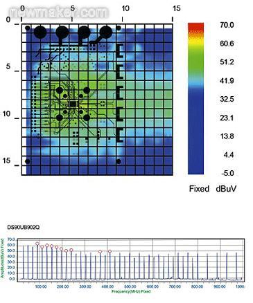 为了量化比较半双工解串器与新一代全双工设计的辐射特性,设计团队再次使用了内部的EMI极近场扫描仪。他们将原来的半双工板放在扫描仪上,进行基线测量。对待测器件加电后,他们在PC上激活了扫描仪。(参见图4)
