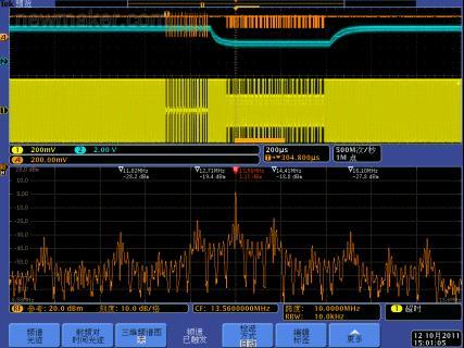 另一个需要严格保证的时间是从读写器发出读卡信号后到标签返回信号的时间。过长或过短的时间都会被认作读写失败。使用传统仪器测量这些信号的难度很大。MDO4000可以将RF信号的AvsT的轨迹完整展示的屏幕中,用户只需用光标定位到相应位置,即可得到这一延迟时间。